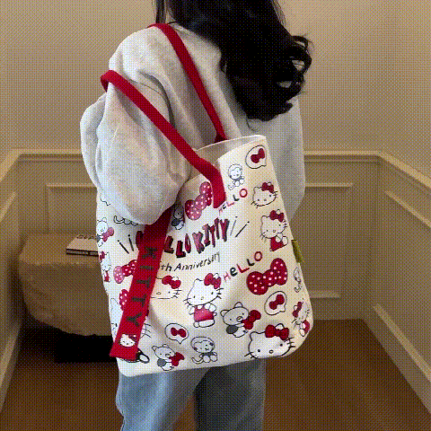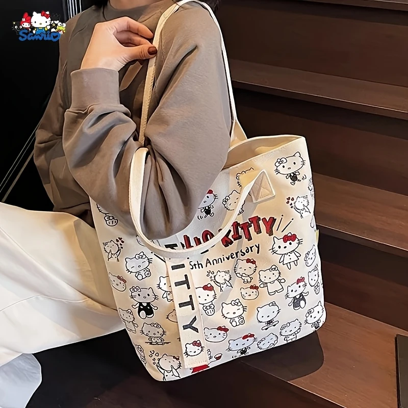 Hello Kitty ✨✨Τσάντα Tote από καμβά - Μεγάλη γυναικεία τσάντα αγορών με μακριές λαβές, κομψή τσάντα ώμου, ευρύχωρη καθημερινή τσάντα Tote, χαριτωμένη τσάντα παντοπωλείου, λευκή με ροζ τελείωμα, κλείσιμο με φερμουάρ, επένδυση από πολυεστέρα, σχέδιο με θέμα